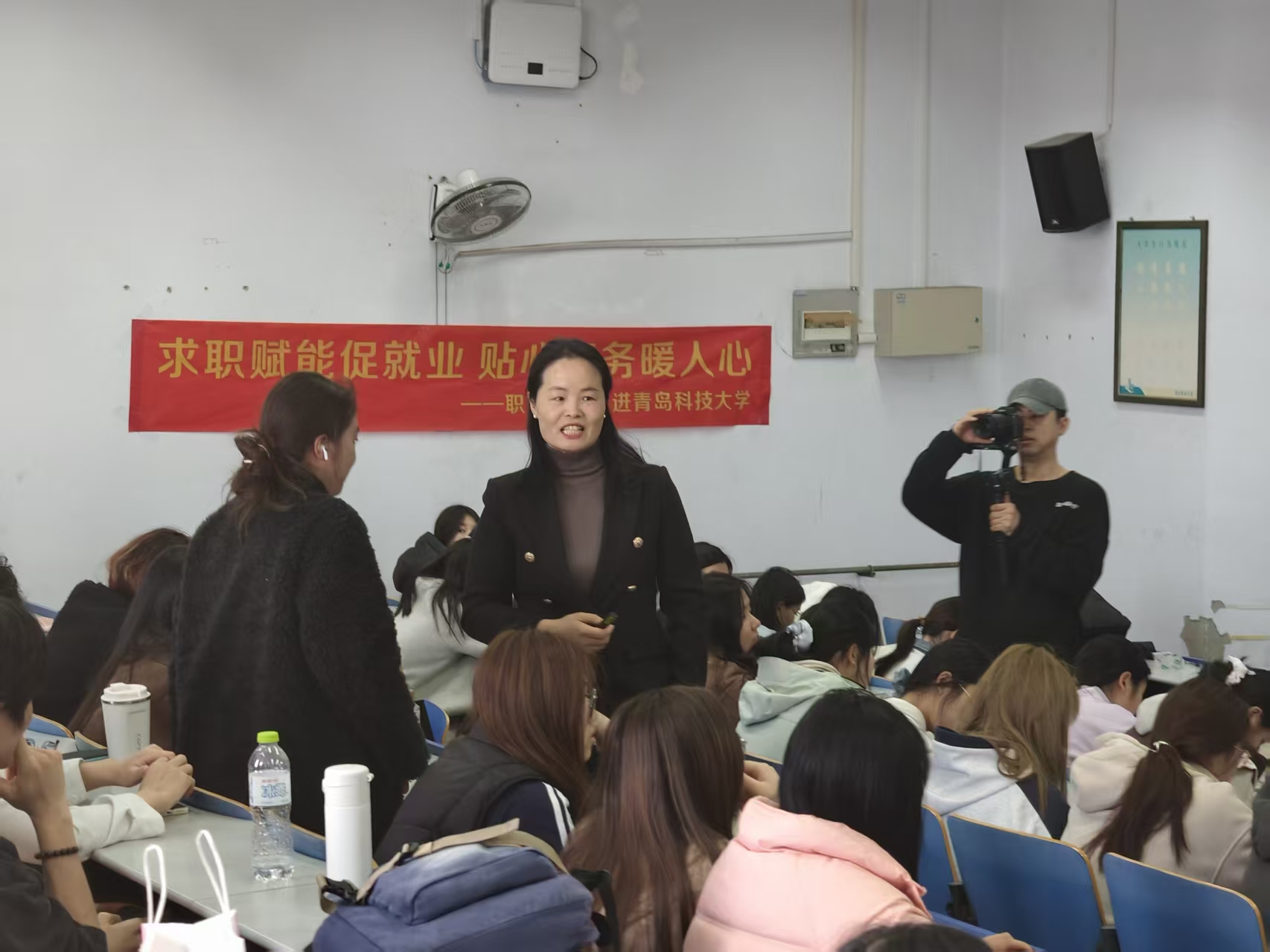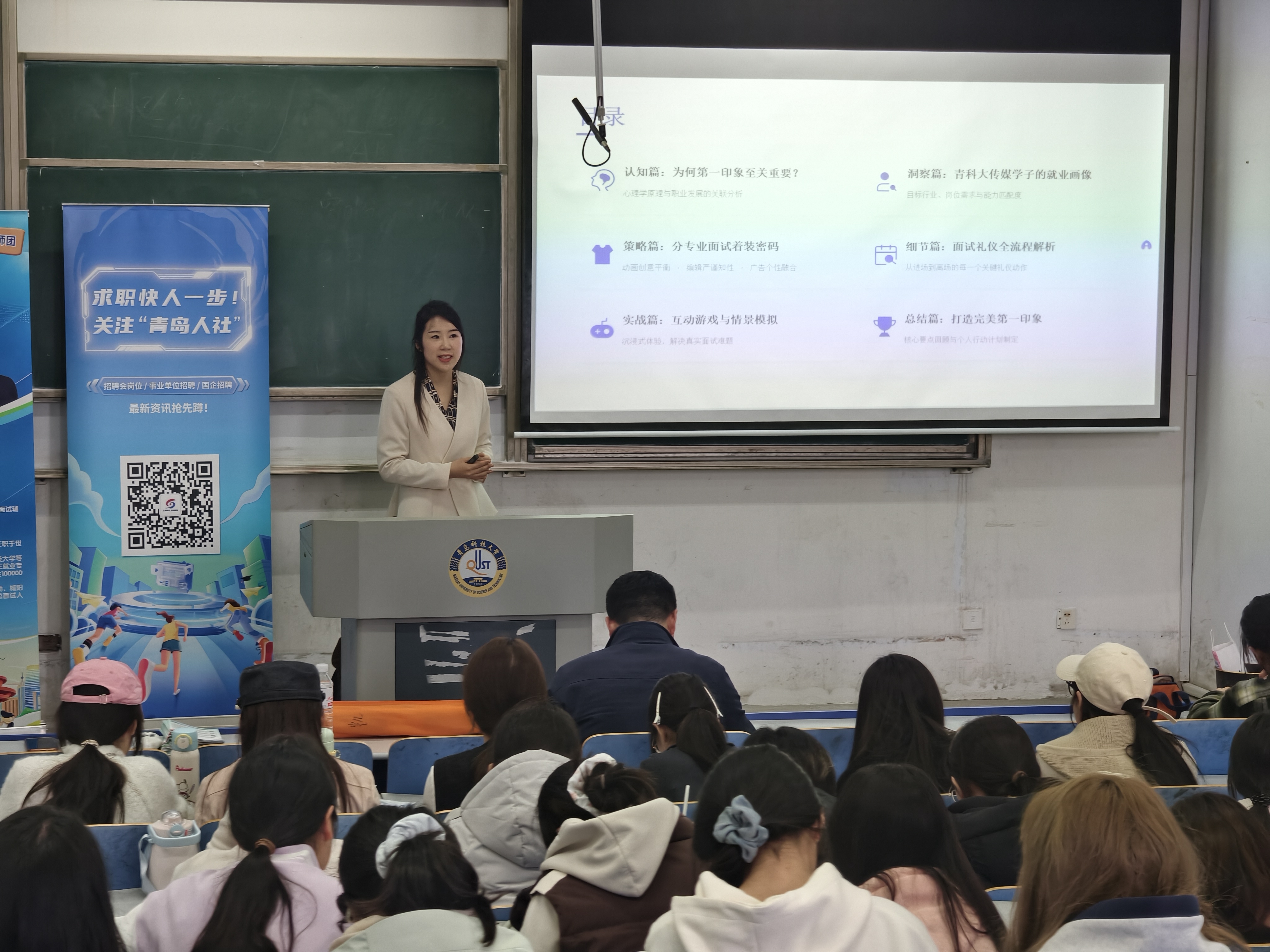 张盈盈聚焦面试着装和全流程礼仪,带来了实用的专题指导。她表示,职场第一印象非常重要,且会直接影响后续的求职评价,是HR筛选候选人的隐性重要标准。针对面试穿搭,她结合男女生不同特点,从发型、妆容、服饰配色等方面给出了精细化的形象建议。针对面试全流程,她从入场等候、现场交流、问题应答、细节避坑等方面逐一讲解,强调要提前到场、保持眼神交流、诚恳应对问题、杜绝小动作等,手把手帮同学们塑造得体专业的面试形象。