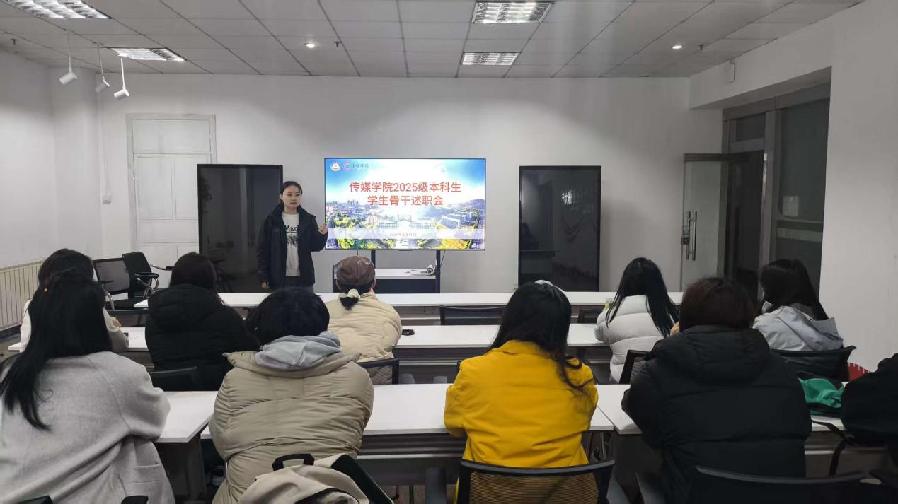为进一步夯实班级建设基础,强化学生骨干责任担当,提升班级管理与服务效能,3月11日,传媒学院在“一站式”学生社区召开2025级本科学生骨干述职会。全体班长、团支书及班级主要学生骨干参加会议。会议由辅导员张凤主持。