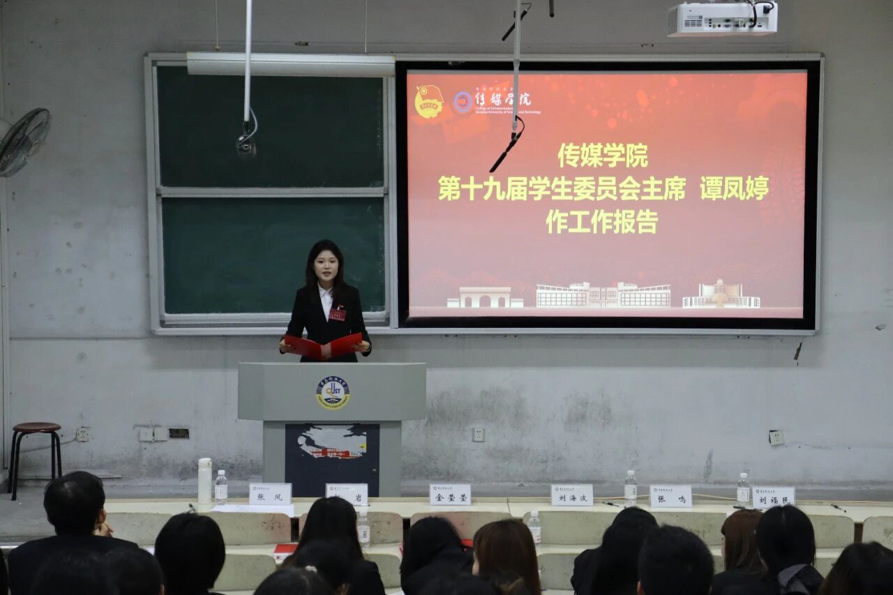 会议第二阶段,传媒学院第十九届学生委员会代表谭凤婷作第十九届学生委员会工作报告,从思想引领、制度建设、宣传工作、合作交流、活动成效等方面做总结,大会审议并通过该报告。
