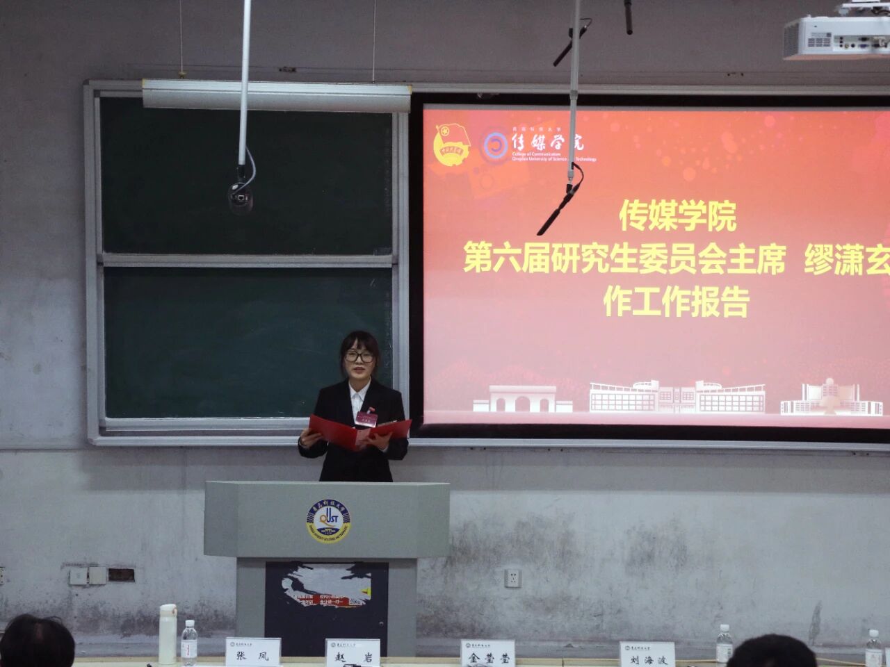 传媒学院第六届研究生委员会代表缪潇玄作第六届研究生委员会工作报告,梳理研究生会在思想引领、组织改革、服务成长、对外联动等方面的相关工作及具体举措,分析不足并表达祝愿。大会审议通过该报告。