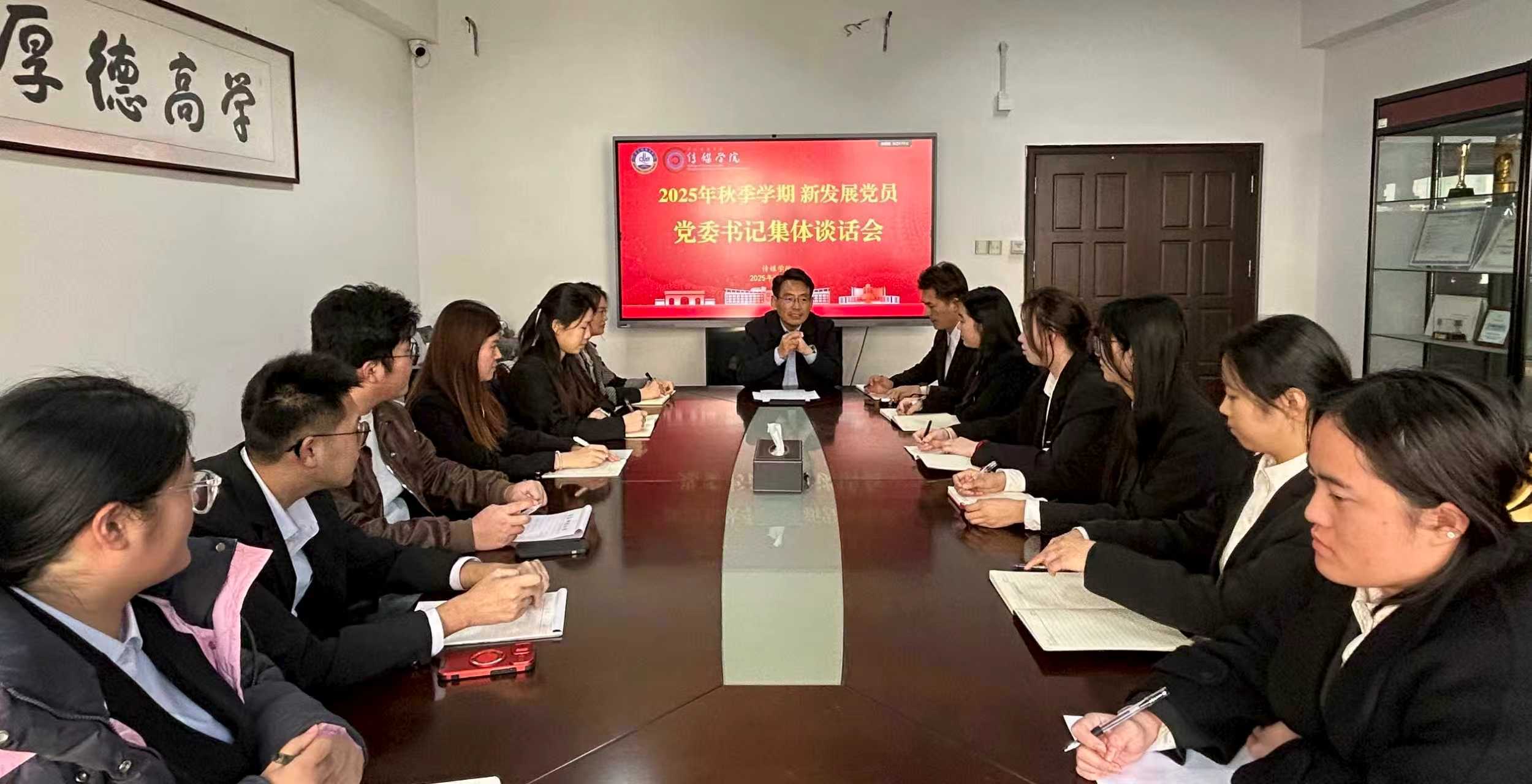 为加强新发展党员教育管理,引导青年党员坚定理想信念、强化责任担当,11月25日下午,传媒学院开展2025年秋季学期新发展党员党委书记集体谈话会。学院党委书记孙洪广与新发展党员面对面交流,以“在品读总书记初心使命中增强‘两个维护’的主动性”为交流主题,为青年党员扣好入党后“第一粒扣子”。