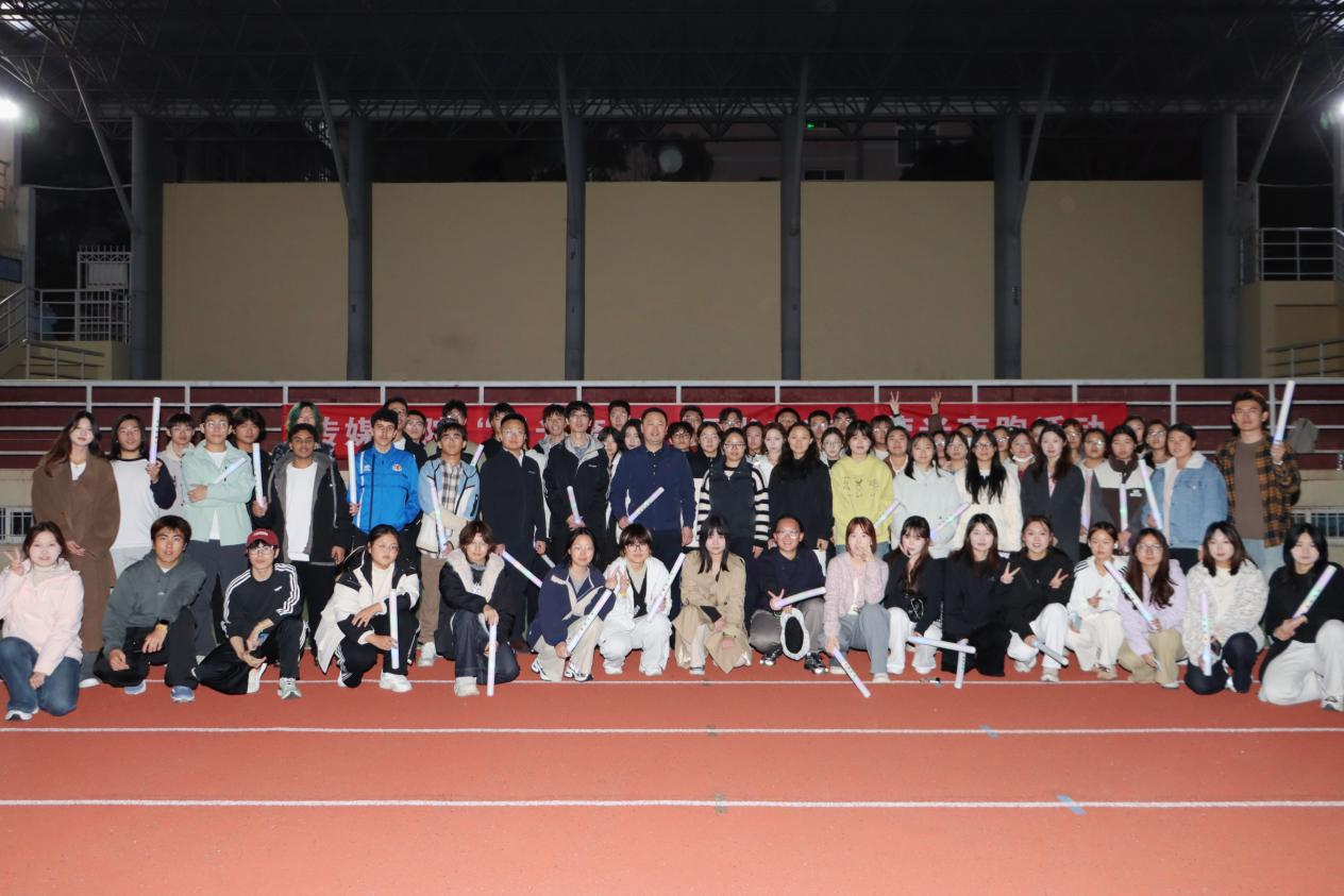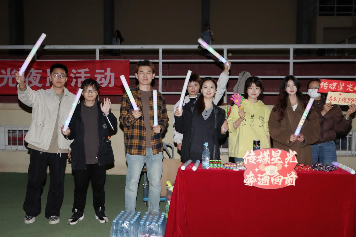 为响应“爱体育·兴科大”校园体育文化号召,进一步丰富学生课余生活、增强身体素质,助力学生身心全面健康发展,11月4日晚,传媒学院于南苑操场举办“星光奔涌,逐光向前”荧光夜跑活动。传媒学院副院长(主持工作)石晨旭,党委副书记兼副院长刘海波,团委副书记兼学工办副主任金莹莹,辅导员赵岩、刘福民、张凤以及60余名本科生、研究生参加活动。活动由金莹莹主持。暖场环节,刘纯佳、王鹏宇同学先后带来《我的未来式》《找自己》《奔跑》三首歌曲,明快的节奏点燃了现场的激情,真挚的演唱引发了阵阵共鸣,让青春的风采在此刻尽情绽放。