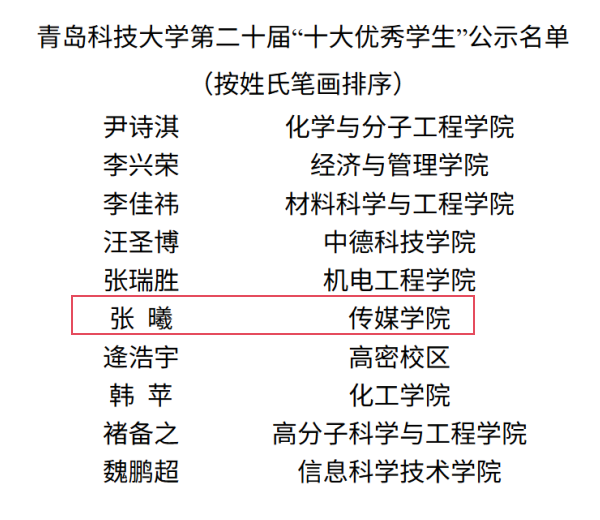 根据《青岛科技大学本科生荣誉奖评选管理办法(修订)》和《关于评选青岛科技大学第二十届“十大优秀学生”的通知》要求,经学院(校区)推荐、资格审核、网络投票、现场评审等环节,最终,我院编辑222班张曦同学突出重围,获评学校第二十届“十大优秀学生”。